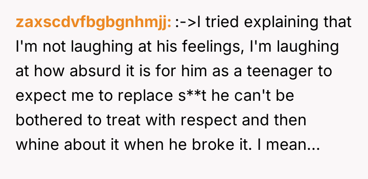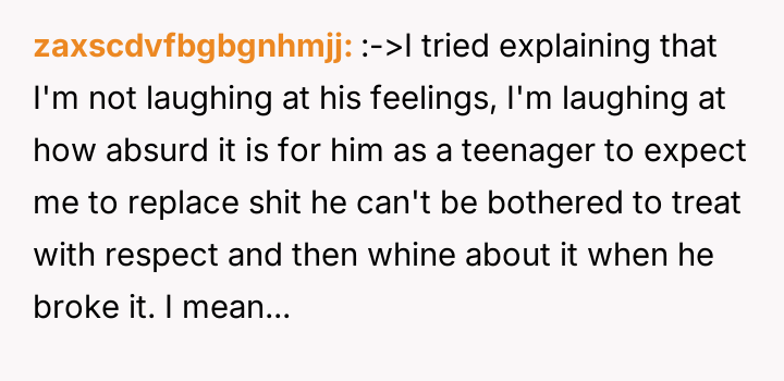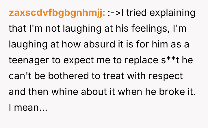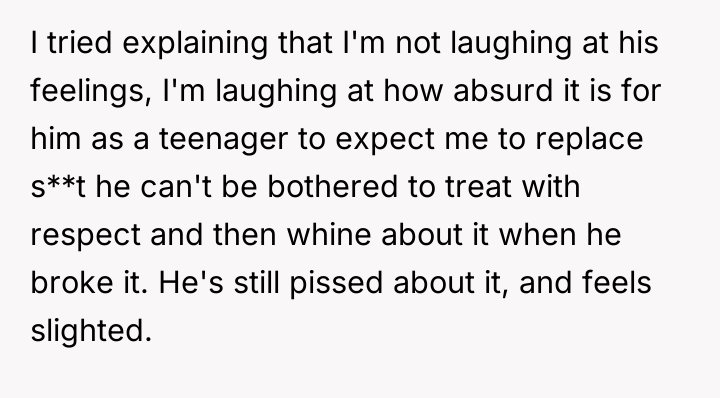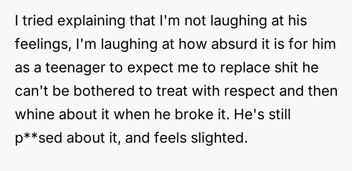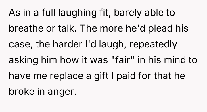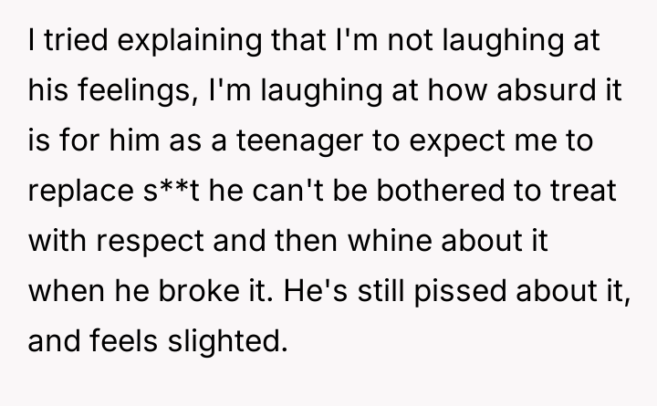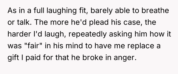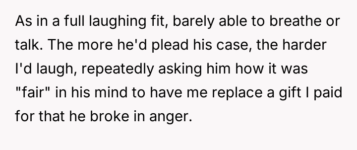 AITA for laughing uncontrollably at my son when he asked me to replace a Christmas gift he broke out of anger?