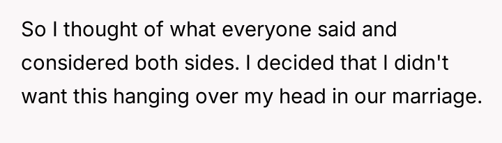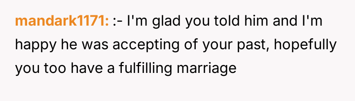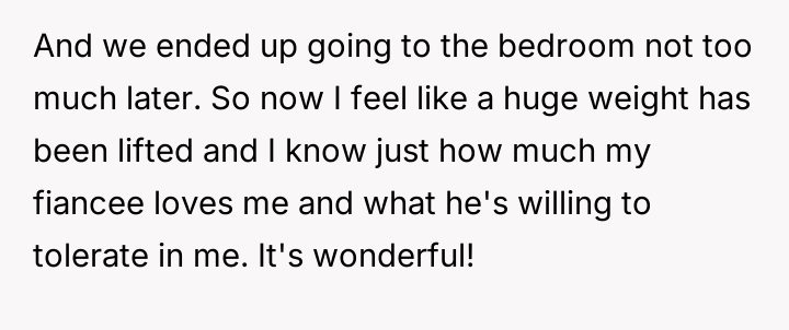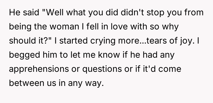 Given the fiancé's apparent acceptance and the lifting of the emotional burden from the OP, the key question remains: Does a partner's unconditional acceptance of a hidden past truly eliminate all future potential for doubt or judgment, or is the revelation simply postponed, potentially resurfacing later under different circumstances?