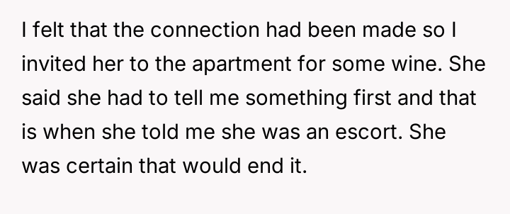 The original poster (OP) experienced significant emotional relief after confessing a secret about their past employment as an escort to their fiancé. The central conflict involved the OP's internal fear of rejection versus the fiancé's acceptance, which ultimately resolved positively when the fiancé prioritized his love for the OP over the past actions.