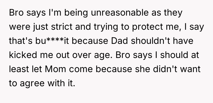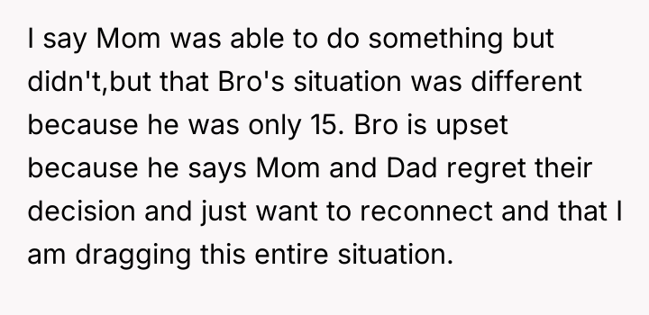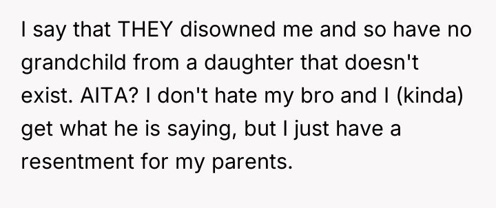 The original poster (OP) harbors deep resentment toward their parents for being forcibly removed from their home years ago due to a relationship choice, resulting in a complete rupture of the parent-child bond. While the OP has built a stable life and family, the younger brother now pressures the OP to forgive the parents and allow access to the grandchild, forcing the OP to defend their long-held boundaries against accusations of being unreasonable and dwelling on the past.