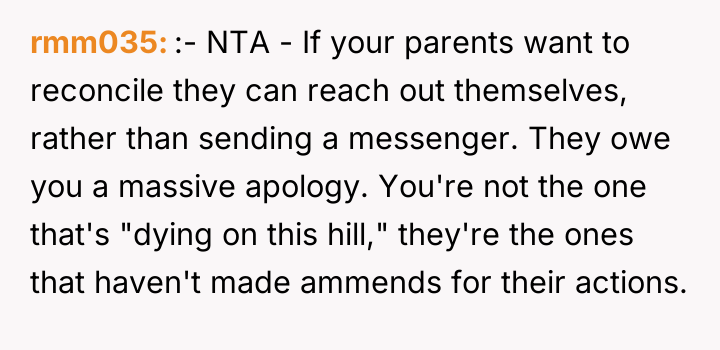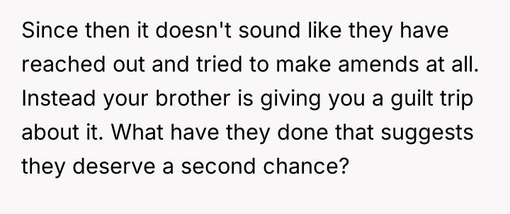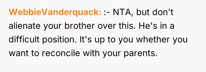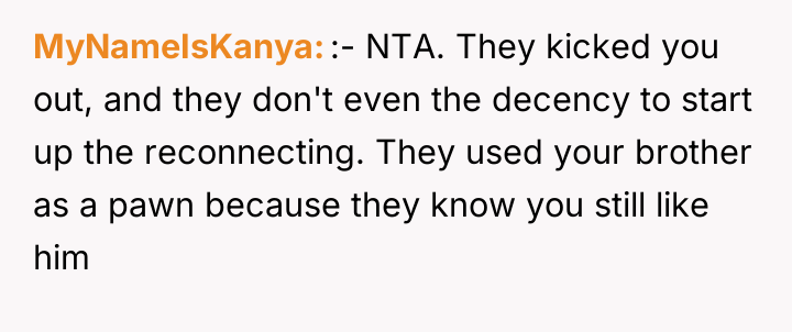 As renowned family therapist Dr. Terry Hargrave explains, “Conflict in families often centers around power and control, and when individuals feel their autonomy is threatened, they will fight to establish their own identity.” The core conflict here is a severe breach of trust and autonomy rooted in the father's absolute control over the household, leading to the OP's eviction at age 20. The OP's decision to align with their partner and build an independent life was a necessary act of self-preservation. Years later, the OP is attempting to maintain the boundary established by that initial rejection. The brother acts as an intermediary, advocating for the parents' desire to reconnect, which puts him in a difficult position, forcing the OP to choose between familial ties (with the brother) and emotional safety (from the parents). The OP is not obligated to forgive or forget severe actions simply because time has passed or because a new family member (the grandchild) has been introduced. The OP's reaction to withhold contact from the parents is an appropriate defense mechanism for past trauma. However, the brother's desire for connection is also valid. A constructive approach involves setting clear, non-negotiable boundaries with the parents regarding contact—if they wish to see the grandchild, they must first engage in direct, respectful communication with the OP. If the parents cannot respect the OP’s autonomy now, they cannot be trusted to respect the OP’s parenting decisions. The OP should maintain the boundary with the parents while clearly communicating to the brother that their relationship remains separate from the parents' exclusion.