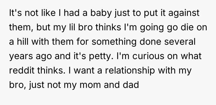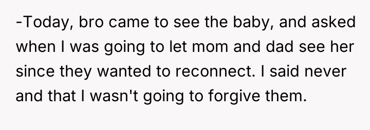 Should the OP maintain a firm boundary, cutting off contact with their parents entirely to protect their emotional peace, or is the potential relationship with their brother and the benefit of family connection for the grandchild worth setting aside past grievances for the sake of reconciliation?