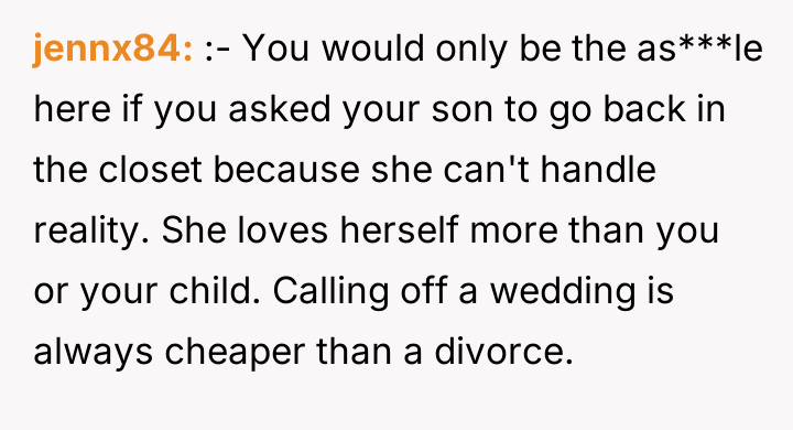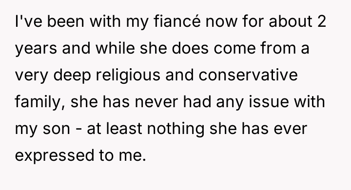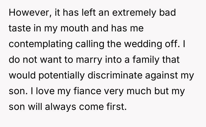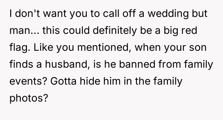 Given that the fiancé has demanded the exclusion of the son's partner and potentially the erasure of his identity to appease her family, is the OP justified in seriously contemplating calling off the entire marriage based on this fundamental disagreement regarding acceptance and future family dynamics?