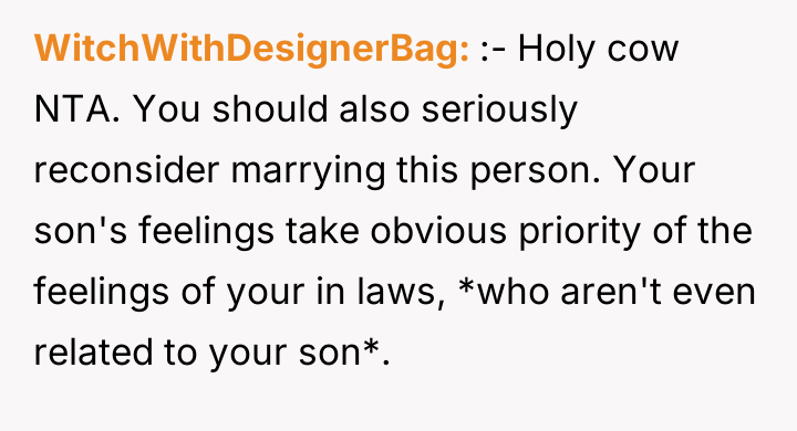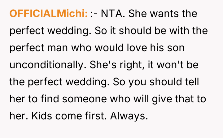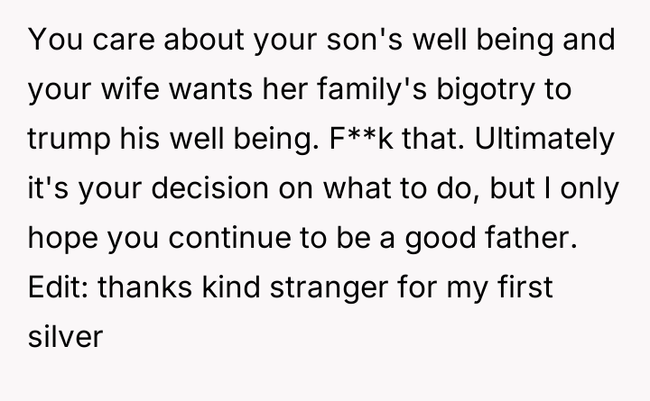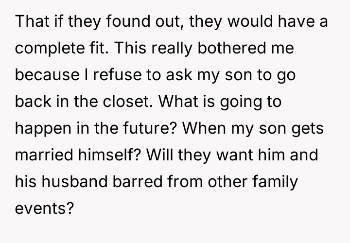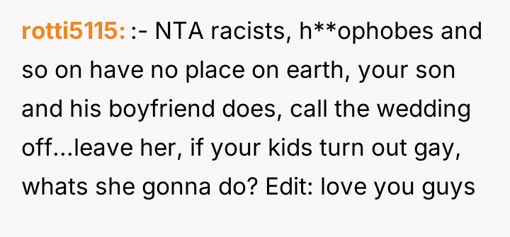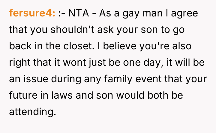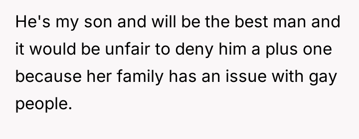 As renowned researcher Dr. Brené Brown explains, “Boundaries are the distance at which I can love you and me simultaneously.” This situation highlights a critical failure in establishing relational boundaries where the fiancé is asking the OP to prioritize her family's comfort (and her desire for a certain kind of wedding) over his core value: unconditional support for his son. The fiancé’s request is not merely about managing one day; it sets a precedent for future family interactions and signals that her need to manage her parents' prejudices outweighs her commitment to her future spouse's primary relationship. The OP correctly identifies that agreeing to this request would force his son back into the closet in front of a segment of the family, undermining years of supportive parenting. The fiancé's reaction—labeling the OP as 'selfish' and giving the silent treatment—indicates poor conflict resolution skills and an unwillingness to compromise on an issue touching upon fundamental respect and acceptance. The OP's actions in refusing the exclusion are appropriate, as protecting a child’s dignity and identity supersedes wedding aesthetics. If the fiancé is unwilling to stand up to her family’s bigotry or cannot accept the OP’s non-negotiable stance on his son’s full inclusion, the relationship foundation is compromised. A constructive recommendation is for the OP to clearly articulate that the issue is not the boyfriend's presence, but the fiancé's willingness to endorse discrimination; if she cannot reaffirm her commitment to fully accepting his son and his partner, then ending the engagement is the healthiest choice for the OP and his son.