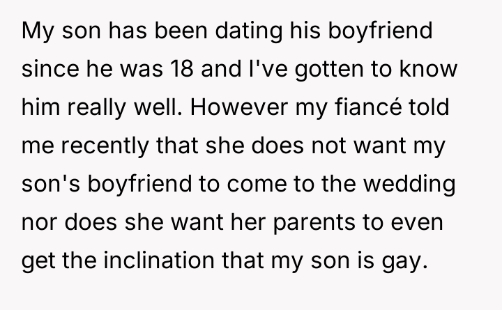 The original poster (OP) faces a significant conflict between his commitment to his son's well-being and identity, and his fiancé's demand to hide his son's relationship for the sake of her conservative family's comfort on the wedding day. The OP's action of refusing to enforce this exclusion, while rooted in deep paternal loyalty, directly clashes with the fiancé's stated desire for a 'perfect wedding' free from family tension.