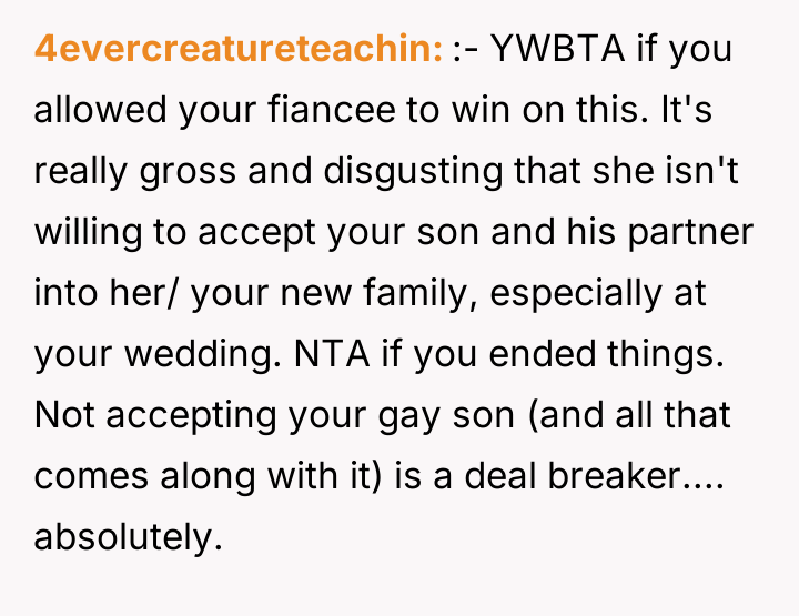 WIBTA if I called off my wedding because my fiance does not want my son to bring his boyfriend to the wedding?