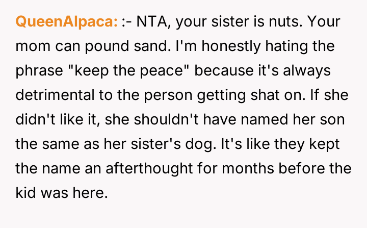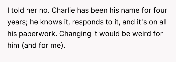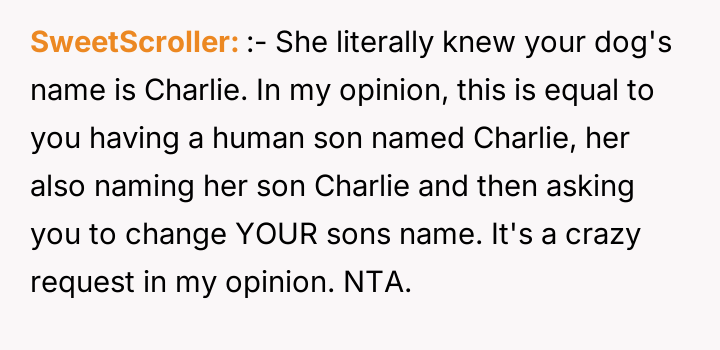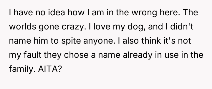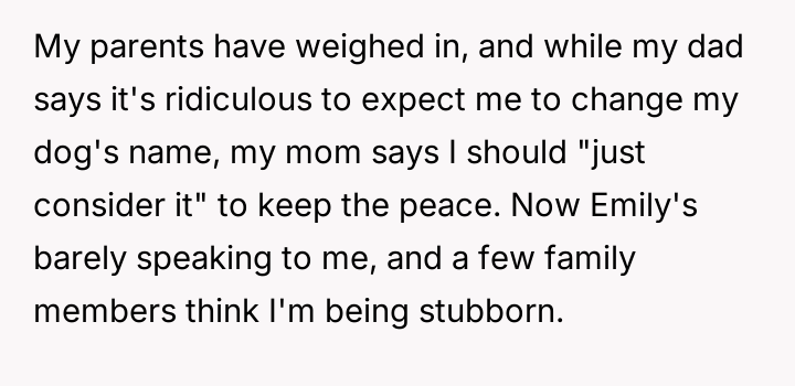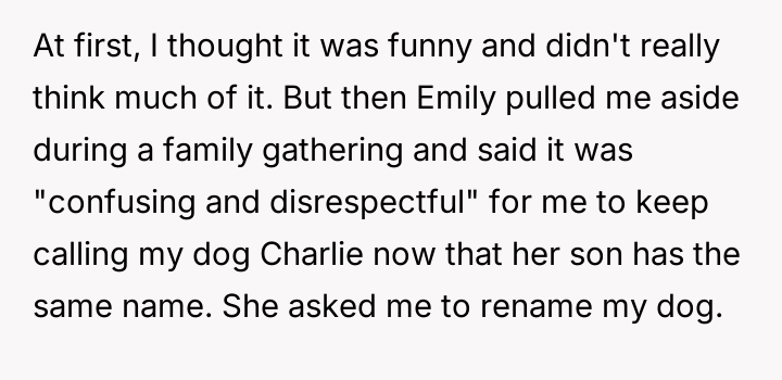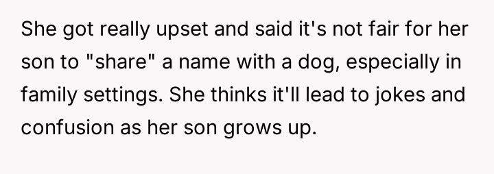 Emily found the shared name confusing and disrespectful, asking the OP to rename his dog. When the OP refused, citing his dog's established name and bond, Emily became very upset, believing her son should not share a name with a family pet. The OP is now facing pressure from family members and is unsure how to resolve the situation.