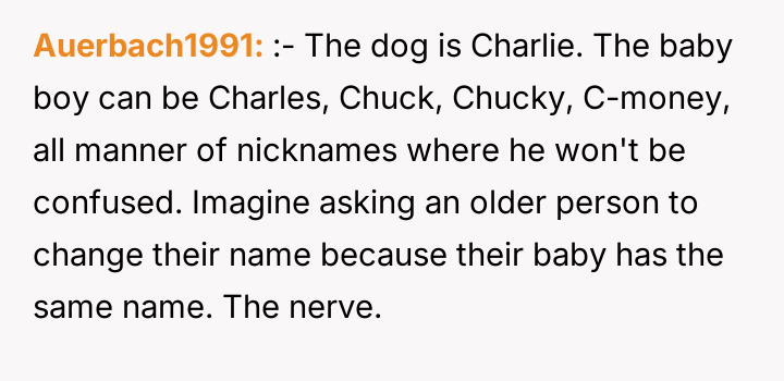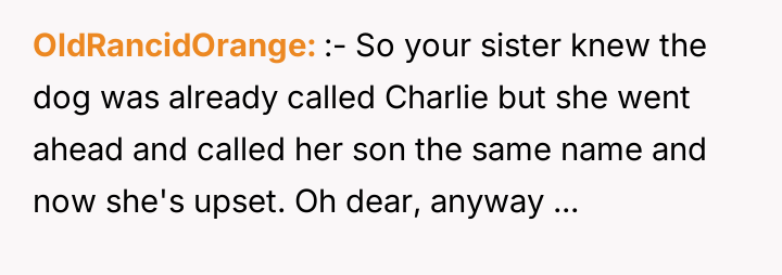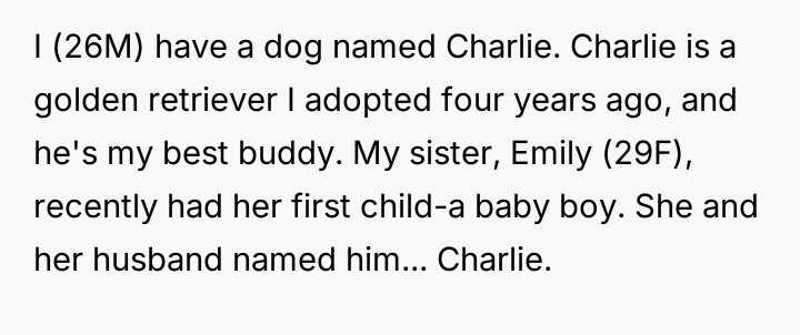 The Original Poster (OP), a 26-year-old man, has a four-year-old Golden Retriever named Charlie. The conflict began when the OP's older sister, Emily, welcomed her first child, a baby boy, and named him Charlie.