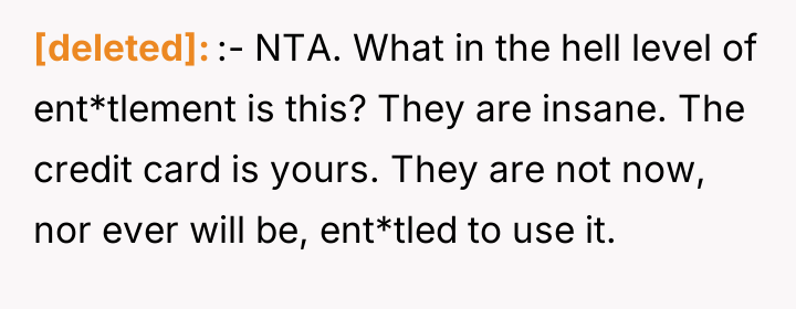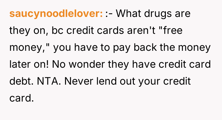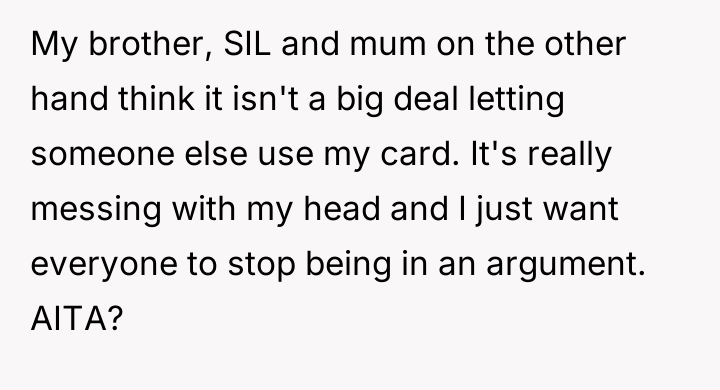 The original poster (OP) is facing a significant conflict where their decision to responsibly manage their new credit card clashes directly with the expectations of their mother, brother, and sister-in-law (SIL), who view the card as an easily accessible source of funds despite their own past debt issues. The OP strongly asserted a boundary concerning their financial tool, which resulted in escalating family tension, including manipulation attempts and temporary estrangement of the mother.