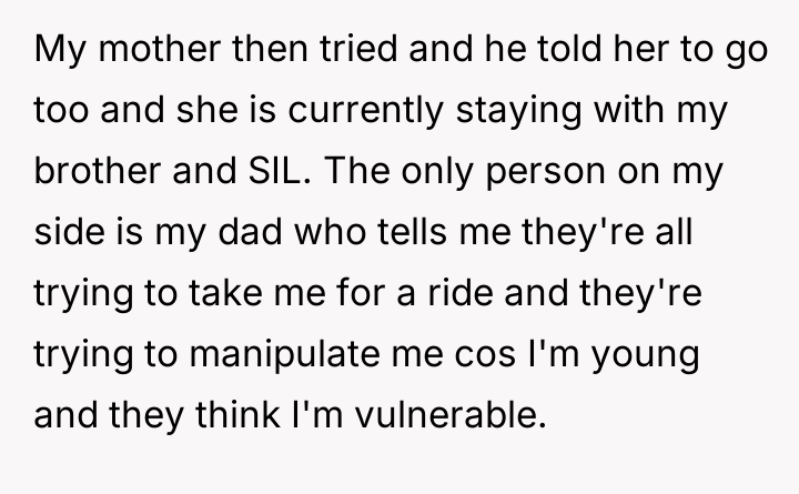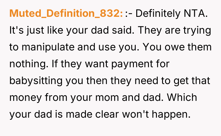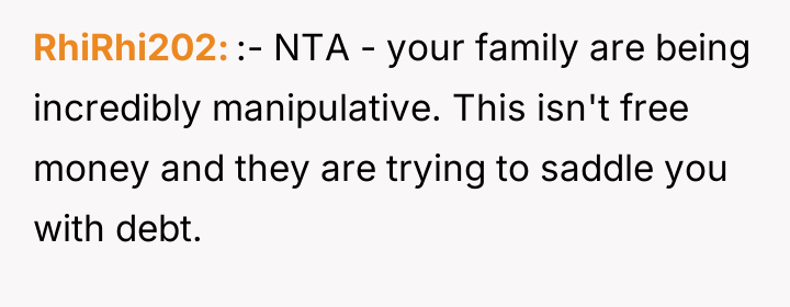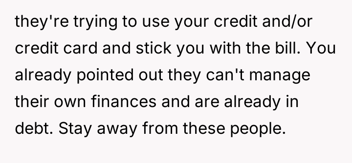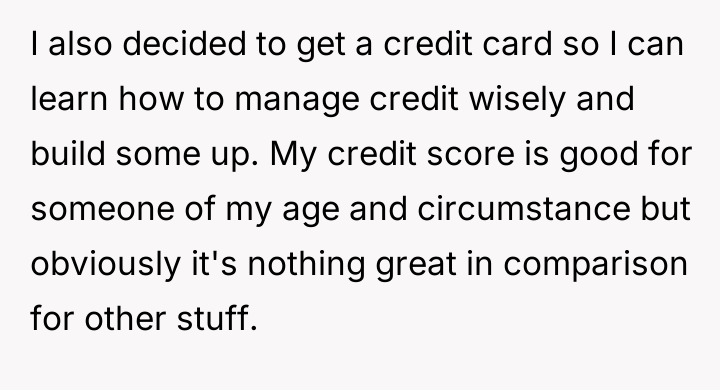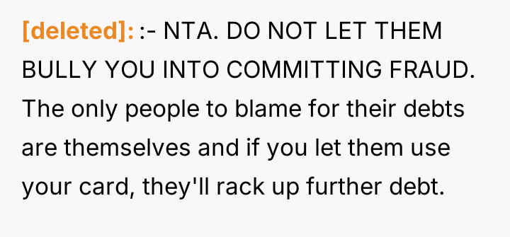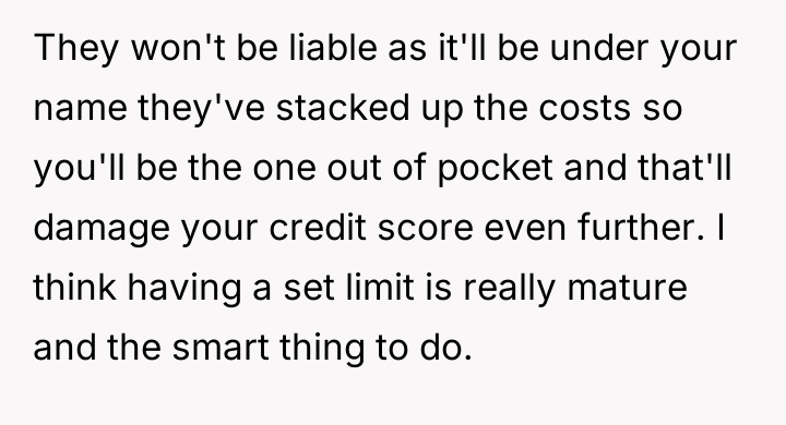 As renowned researcher Dr. Brené Brown explains, “Boundaries are the distance at which I can love you and me simultaneously.” The situation presented by the 22-year-old OP is a classic confrontation between personal financial autonomy and familial entitlement, overlaid with a power dynamic based on age and perceived vulnerability. The OP demonstrated financial responsibility by opening a credit card specifically to build credit, understanding the risks involved, and setting a low usage limit for personal financial education. The brother and SIL immediately tried to bypass this boundary, framing their request as a right or a favor owed to them for past caregiving, which is a clear tactic of emotional leverage and manipulation. The OP’s refusal was entirely appropriate; lending a credit card, especially to individuals with a history of debt from excessive use, is financially reckless and compromises the primary user's credit standing. The escalation involving the mother highlights a breakdown in recognizing the OP's adulthood and independence. The OP's primary goal—learning responsible credit management—is incompatible with allowing others with known poor habits to use the card. The resulting family conflict, while painful, confirms the necessity of the boundary. To handle this more effectively, the OP should maintain the firm refusal, perhaps communicating through their supportive father. Moving forward, the OP should limit financial discussions with the mother and brother entirely, focusing instead on strengthening their own financial footing as they prepare to transition to full-time work.