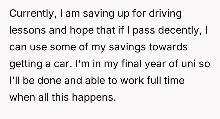At just 22, she stands on the brink of independence, carefully navigating the complex world of finance with cautious optimism. Living at home while finishing university, she shoulders responsibility by contributing rent and managing her own expenses, all while saving diligently for the milestones ahead—driving lessons and her first car, symbols of freedom and self-reliance.