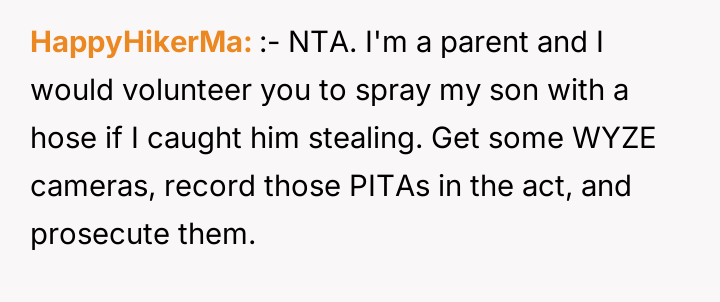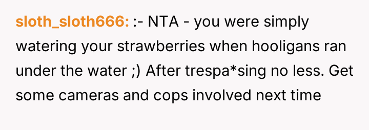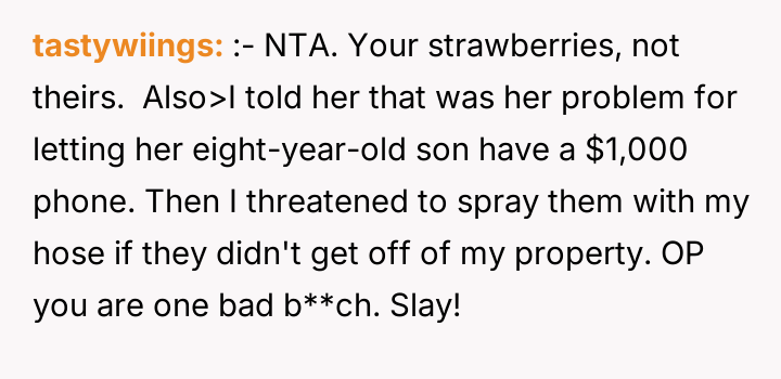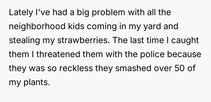 The original poster (OP) is deeply frustrated by repeated theft and property damage caused by neighborhood children raiding their extensive strawberry garden, leading to an escalation where they chose to physically repel the children with a hose rather than involving law enforcement immediately. The central conflict lies between the OP's right to protect their hard work and property and the parents' denial of responsibility for their children's destructive behavior, which has now resulted in legal threats against the OP.