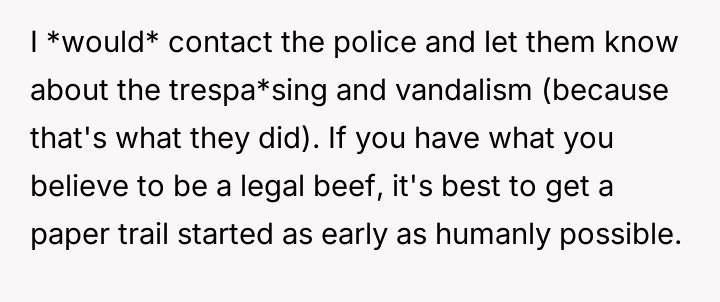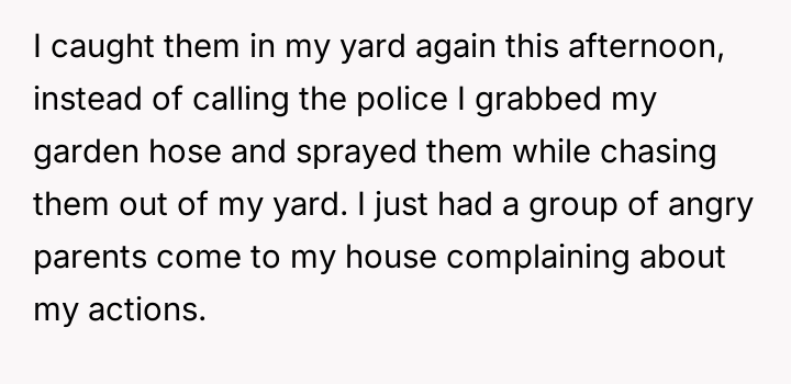 Does the severity of property damage justify the use of water expulsion as a defensive measure against trespassing minors, or did the OP cross a reasonable line of force, especially considering the subsequent escalation involving property damage claims against the OP?