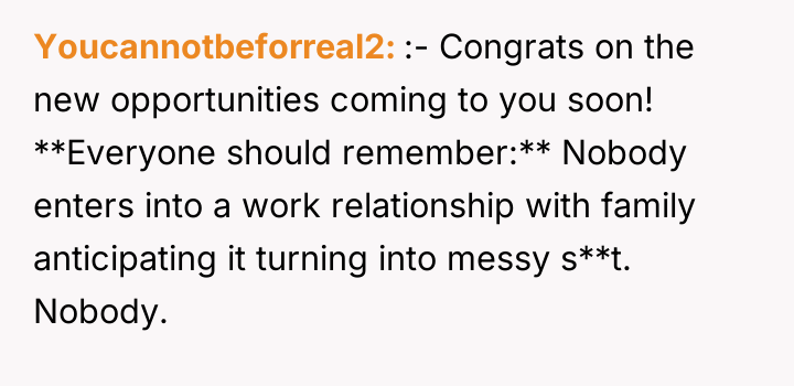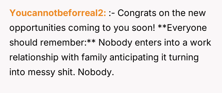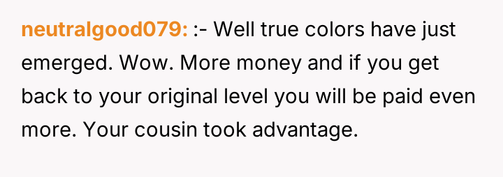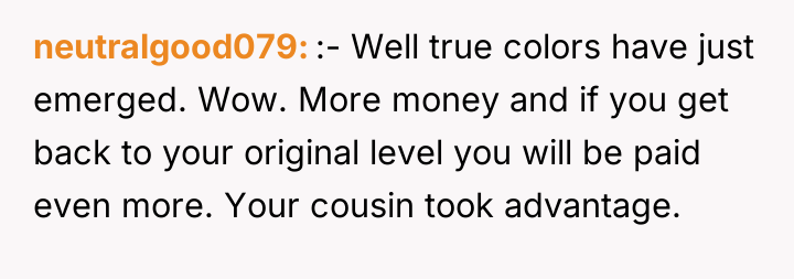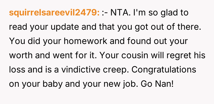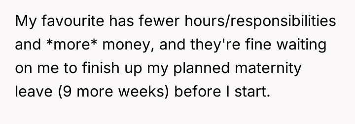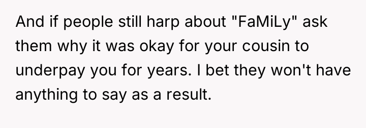 As renowned organizational psychologist Dr. Adam Grant explains, “When people feel their contributions are not valued, they become disengaged and are more likely to seek opportunities elsewhere.” This situation clearly illustrates a failure in recognizing and appropriately compensating an employee, especially when that employee is performing critical functions while on extended leave. The original poster (OP) demonstrated strong self-advocacy by researching market rates, securing formal offers that validated their worth, and presenting this data professionally. The cousin's reaction—'flying off the handle'—suggests an emotional response rooted in entitlement or an inability to separate familial roles from business realities. The OP's calculated move to leverage their impending maternity leave (which they were owed compensation for) to secure a clean exit while securing their future employment was an appropriate business maneuver in the face of poor management. The subsequent family drama, instigated by the cousin attempting to mobilize relatives, highlights the high emotional cost of mixing business and family. The OP's action to remove themselves from an exploitative arrangement was professionally sound. Moving forward, the constructive recommendation is to maintain firm boundaries with extended family regarding business matters and rely on objective data, as the OP did, when renegotiating terms or seeking new employment.