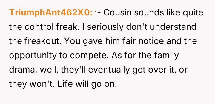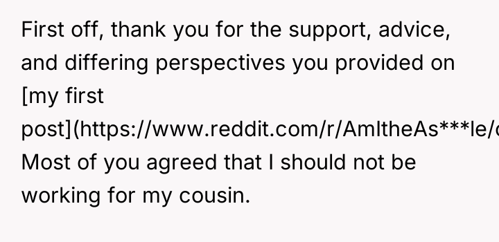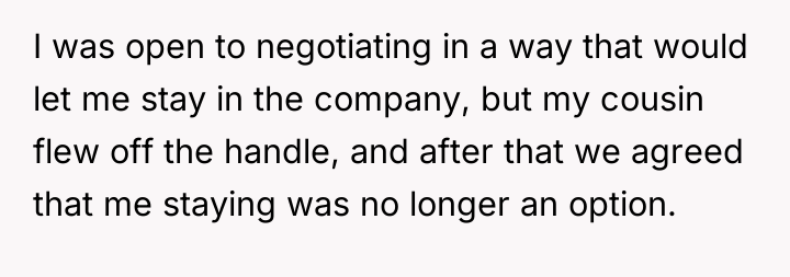 The original poster faced a situation where their professional value was unrecognized by their cousin's company, leading to burnout due to overwork and underpayment. Despite presenting clear evidence and attempting negotiation for a sustainable arrangement, the cousin reacted poorly, forcing the poster to accept a better outside offer and resign, escalating the conflict into a family dispute.