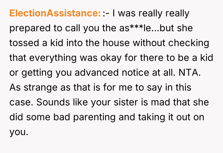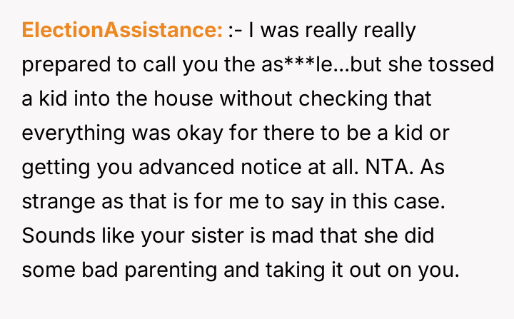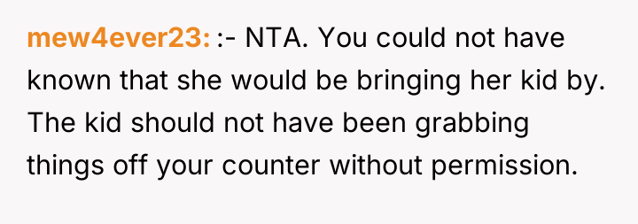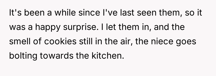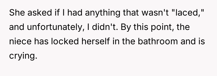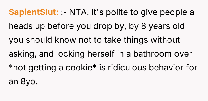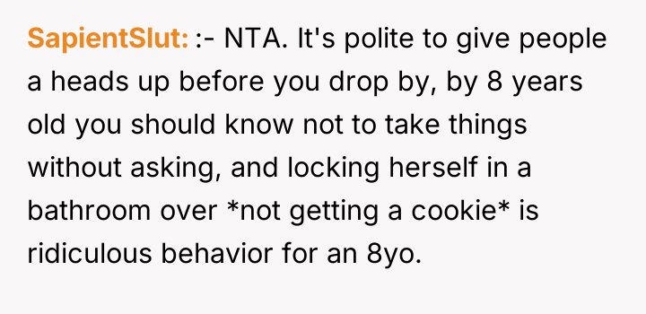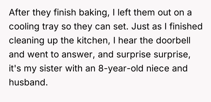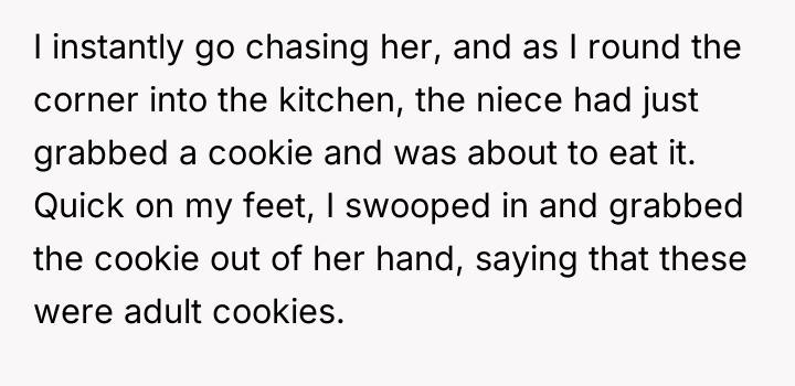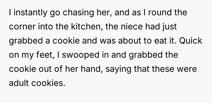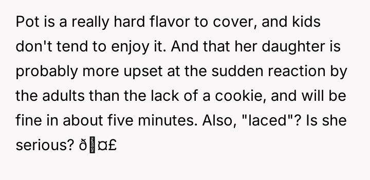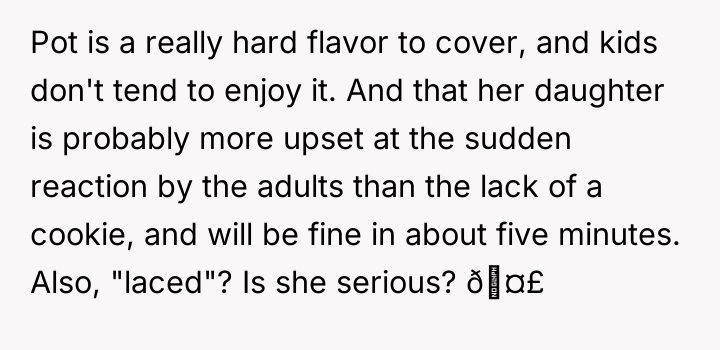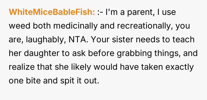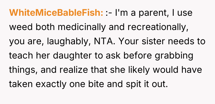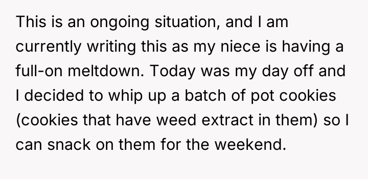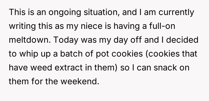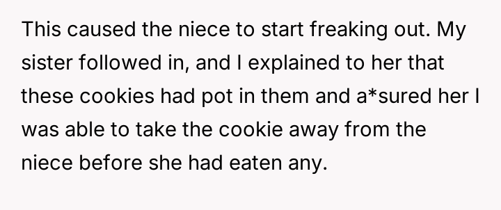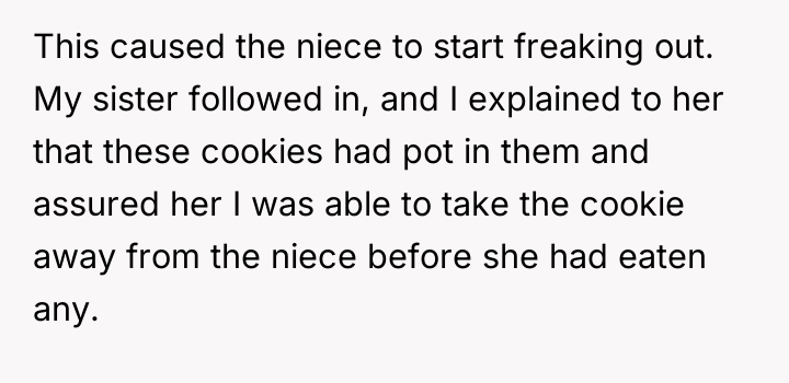 From an ethical standpoint, when dealing with substances like THC, even where legal, the burden of preventing accidental ingestion by minors rests heavily on the person possessing the substance. While the sister’s surprise visit complicated the scenario, the OP’s failure to secure the freshly baked, highly appealing items—even temporarily—before answering the door created the immediate hazard. The verbal retaliation by the OP, blaming the niece's behavior, escalated the emotional distress. A more constructive approach would have involved immediate apologies focused on the lapse in childproofing, followed by a calm discussion with the sister about future notification protocols. The OP should implement a strict rule: all edibles must be secured immediately after baking, regardless of whether guests are expected.