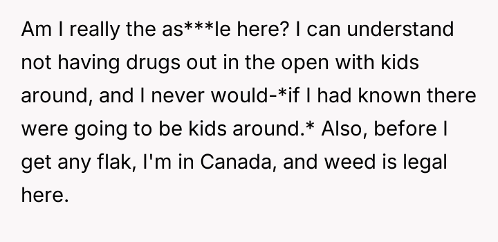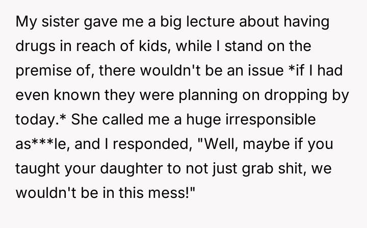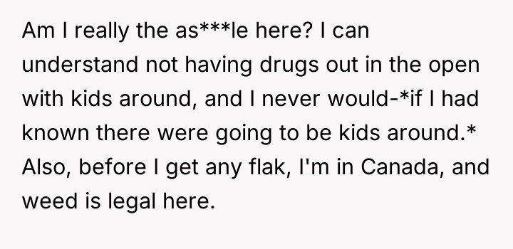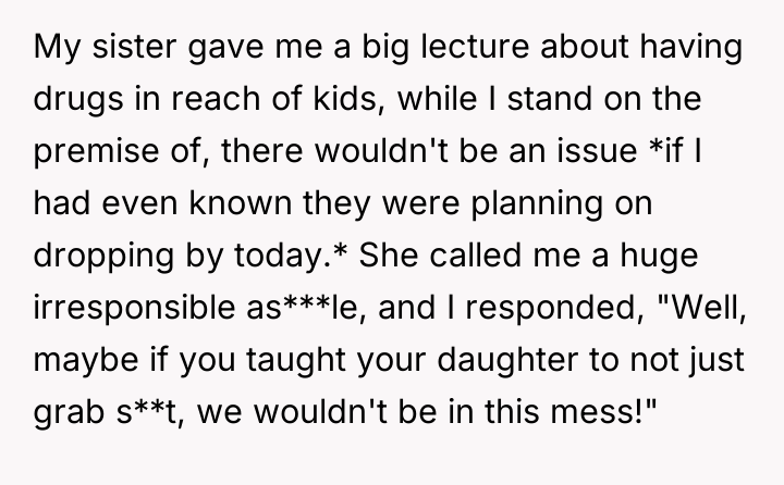 The original poster (OP) feels defensive because the conflict arose from an unexpected visit, arguing that his actions were reasonable given his assumption of being alone. His sister, however, holds the firm position that storing any psychoactive substance within reach of a child is fundamentally irresponsible, regardless of prior knowledge.