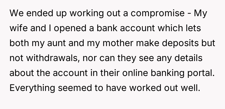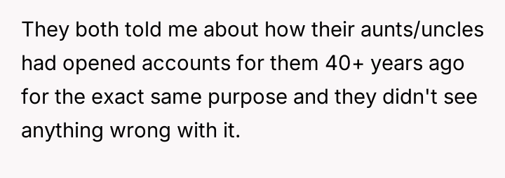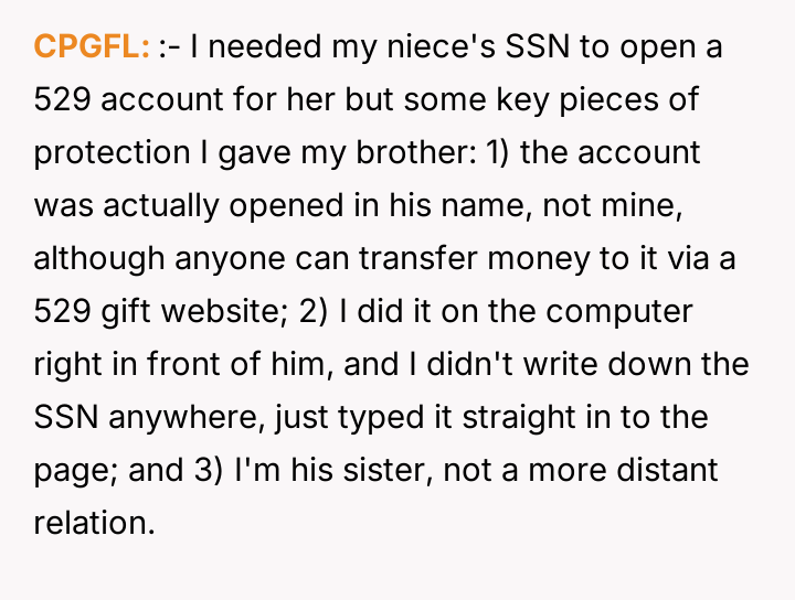 As renowned financial educator and author, Suze Orman, states, “Protecting your Social Security number is paramount; it is the key to your financial life.” This principle applies with even greater urgency to minors whose financial identities are entirely dependent on their guardians' vigilance. The OP's refusal to immediately hand over the Social Security Number (SSN) directly addresses the modern reality of identity theft, a risk significantly higher now than 40 years ago, especially following major data breaches like Equifax. The initial motivation from the aunt and mother—setting up funds—was rooted in positive intent, but their methodology was dangerously outdated. This scenario highlights a common intergenerational conflict where established social practices clash with current security requirements. The OP correctly prioritized legal and digital security over familial convenience. The compromise reached—a restricted deposit-only account—was an appropriate resolution, balancing the relatives' desire to contribute financially with the OP’s need to maintain control over withdrawal access and account secrecy. Moving forward, the OP should proactively communicate that all future financial gifts for the child must be channeled through vetted, legally structured custodial accounts (like UTMA/UGMA or 529 plans) where SSNs are not required for initial setup by third-party contributors, thus preventing future boundary discussions.