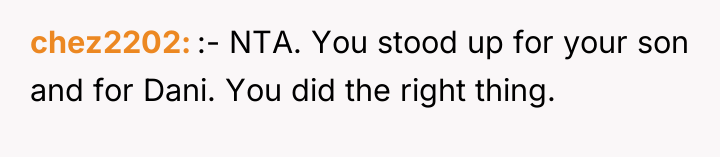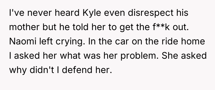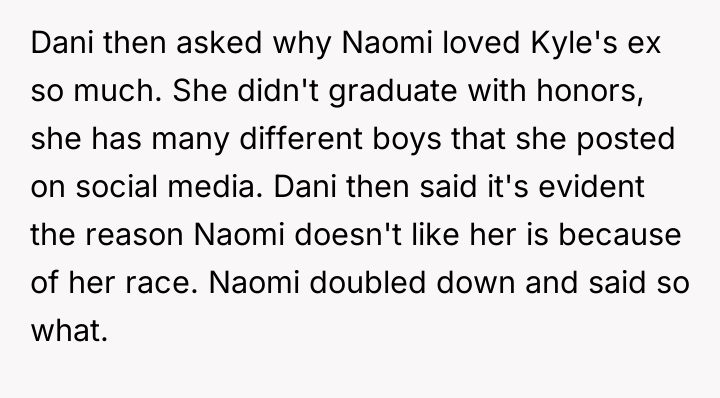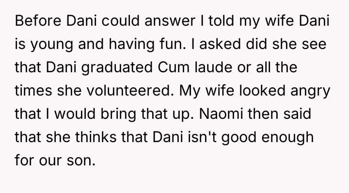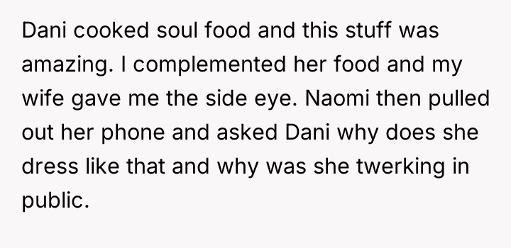The conflict escalated during a dinner where Naomi criticized Dani's appearance and behavior based on social media posts, ignoring her academic achievements. When Kyle confronted his mother, the situation boiled over, leading Kyle to aggressively tell Naomi to leave. The OP sided with Kyle, harshly confronting Naomi about her perceived racism and hypocrisy, leaving her deeply upset and isolated. The OP now questions if he was too harsh in defending Dani and confronting his wife.