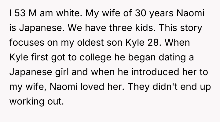 A 53-year-old white man, is dealing with a significant conflict between his wife of 30 years, Naomi (Japanese), and his 28-year-old son, Kyle, over Kyle's girlfriend, Dani, who is Black.