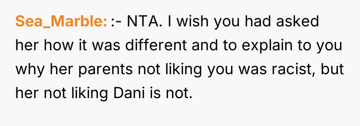 Dr. Eleanor Vance, a family dynamics specialist, often notes that long-term marital conflicts rooted in cultural identity often surface when children choose partners outside the parents' initial expectations. She states, 'When external biases—such as racial prejudice—are introduced into a closed family system, the resulting conflict tests the established boundaries and loyalty structures within the marital unit itself.' The OP’s behavior was a clear response to perceived injustice. Naomi’s criticism—focusing exclusively on Dani’s style (hoop earrings, nails) while ignoring her accomplishments, and then justifying prejudice against her race, mirrors classic in-group bias where the 'other' must meet an impossibly high standard to gain acceptance. The OP recognized this dynamic, especially since Naomi’s parents previously showed bias against him for being white. His decision to support his son and stand against his wife’s racism was a strong assertion of his moral boundaries and loyalty to his immediate family unit over his wife's cultural prejudices. However, the execution was highly confrontational. By calling his wife a racist and hypocrite and invoking her parents' behavior while she was already upset, the OP escalated the conflict from addressing the bias against Dani to a direct, potentially damaging character attack on Naomi. A more strategic approach might have been to halt the discussion immediately after Kyle told her to leave, allowing the intense emotional reaction to subside before initiating the post-incident confrontation. While the OP’s stance on the prejudice was correct, the delivery likely prioritized immediate catharsis over long-term conflict resolution.
