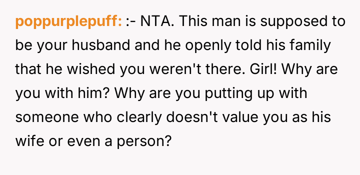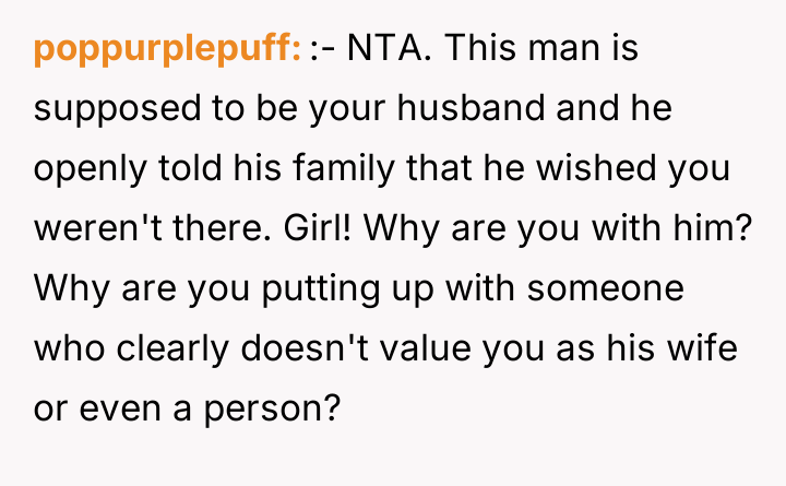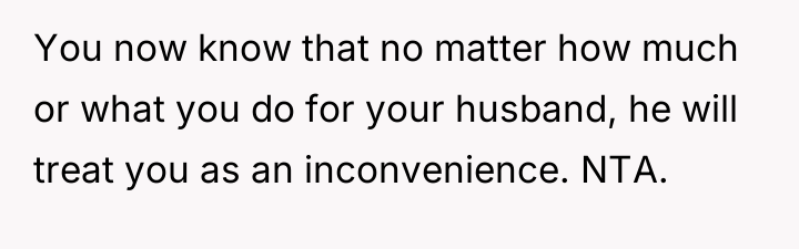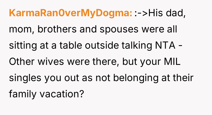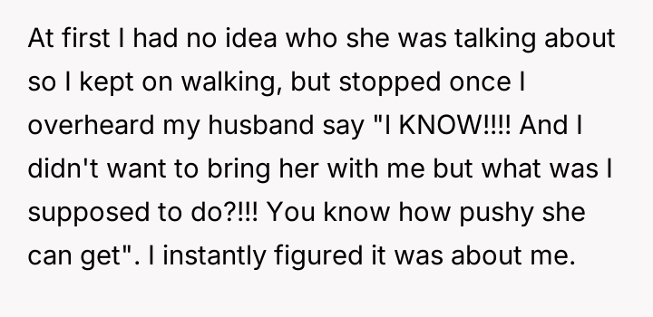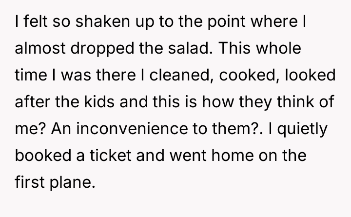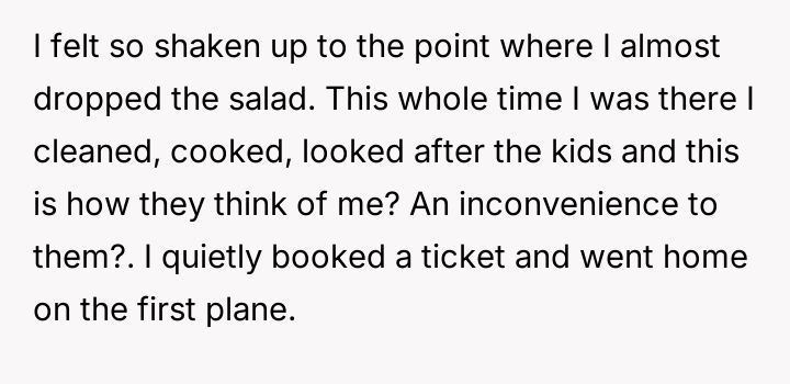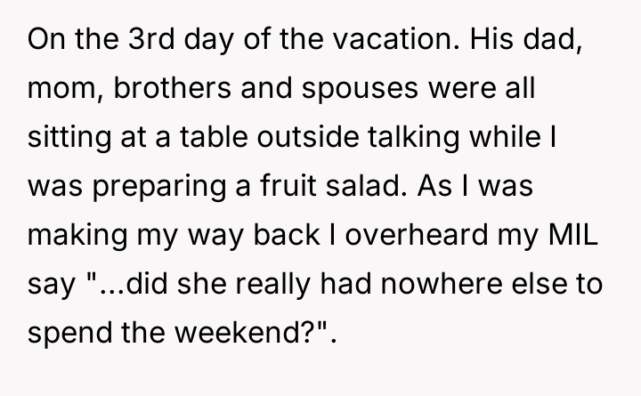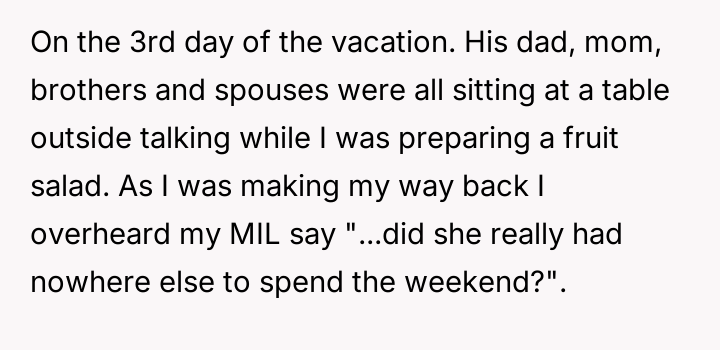 The original poster (OP) felt deeply hurt and invalidated after overhearing negative comments from her mother-in-law and husband regarding her presence on the family vacation, leading her to abruptly leave. Her action of leaving was a response to feeling unwanted and unappreciated, directly conflicting with the husband's expectation that she should have remained and managed the situation without immediate confrontation or departure.