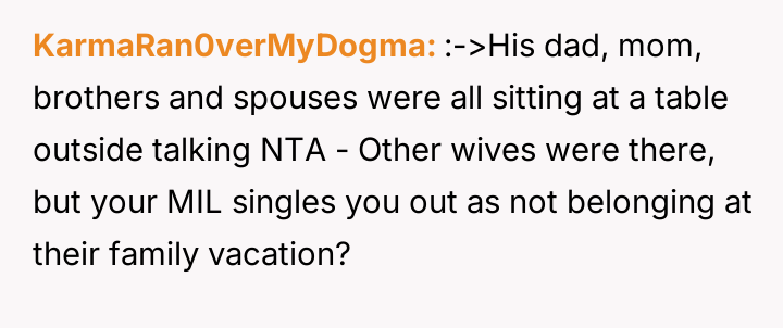 As renowned psychologist Dr. John Gottman explains, ". . . there is no relationship that doesn’t have conflict. Conflict is inevitable, but so is the opportunity to repair." The OP's primary motivation for attending the vacation was to foster connection with her husband's family, an effort that was undermined by the covert criticism she overheard. The exchange between the OP's husband and mother-in-law (MIL) reveals a significant issue of boundary setting and unmanaged negative feelings within the family structure. The husband's statement that the OP was 'pushy' indicates he may have agreed to her attendance out of obligation rather than genuine desire, and he failed to defend her when his own mother minimized her presence. The OP's subsequent action of leaving was an extreme emotional response driven by a perceived betrayal and insult, compounded by the fact that she felt she had been actively contributing (cleaning, cooking) only to be viewed as an inconvenience. The husband's reaction, labeling her departure as 'disrespectful and juvenile' while simultaneously dismissing her valid reason for leaving (overhearing the comments), demonstrates poor conflict management and a failure to validate her feelings. His focus on the 'bad impression' suggests prioritizing external appearances over addressing the core emotional injury. A more constructive approach would have involved the husband acknowledging the pain caused by his and his mother's words, validating her right to feel upset, and then collaboratively discussing the timing and method of her departure. Moving forward, the OP needs to establish clear, respectful boundaries about acceptable communication, and the couple must practice 'repair attempts' to rebuild trust damaged by this incident.