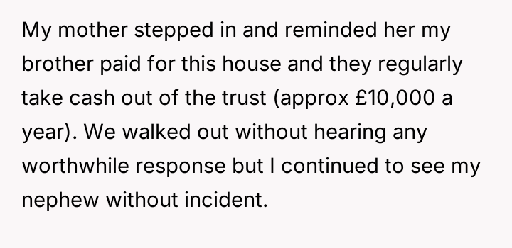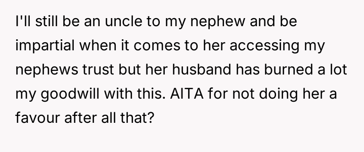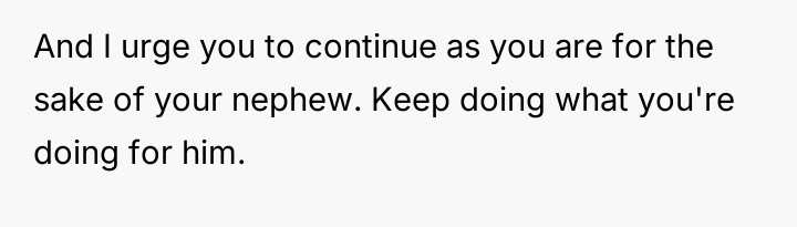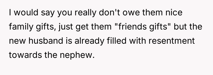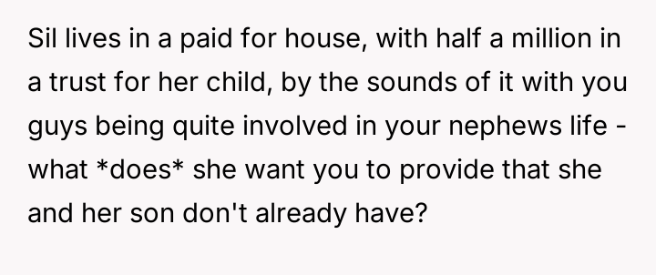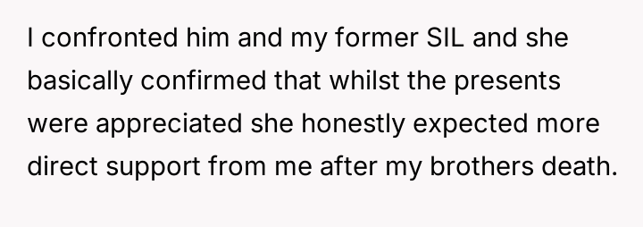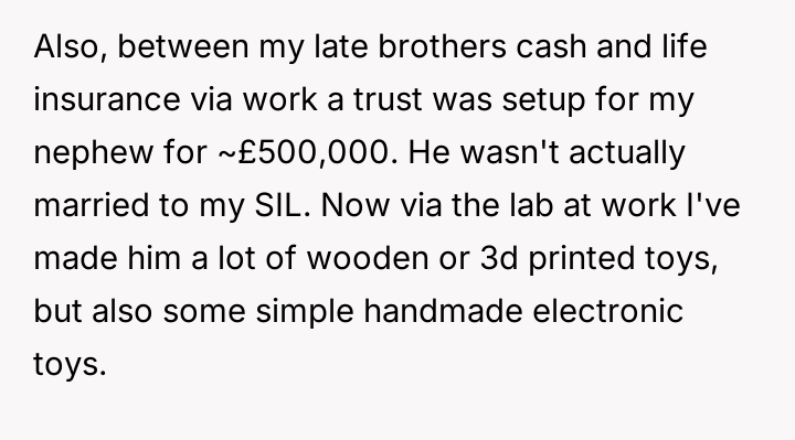 The original poster (OP) is deeply conflicted, feeling unappreciated for significant personal effort and creative gifts provided to their nephew following the brother's death. The central conflict arises from the former sister-in-law (SIL) treating the OP's handmade items as simple favors while simultaneously expecting ongoing, resource-intensive support, which the OP views as a violation of the boundaries set by their unique family role and the management of the nephew's trust fund.