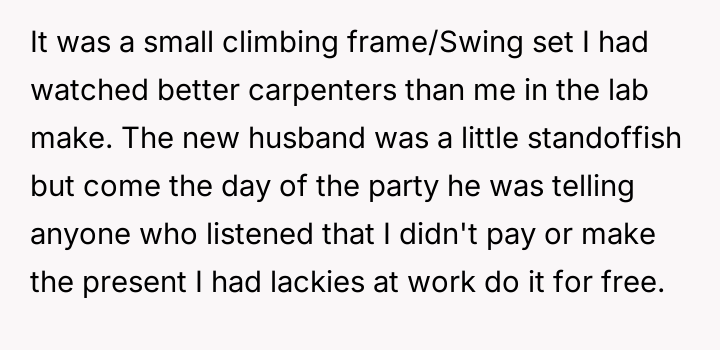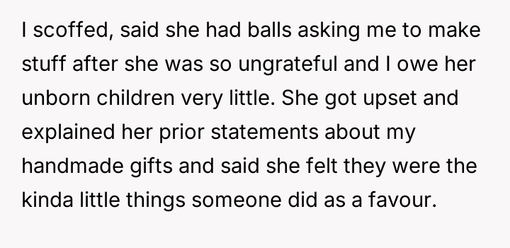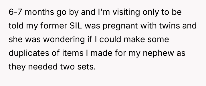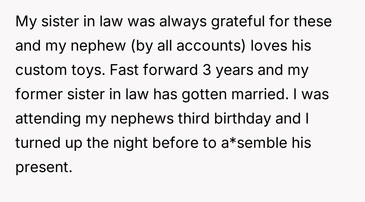 AITA for no longer making toys and furniture for my former SIL after her new husband called them an “embarra*sment” and me cheap for not paying for stuff?