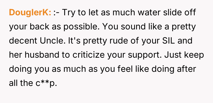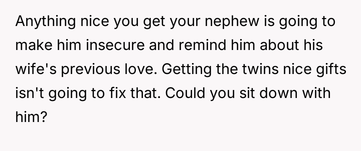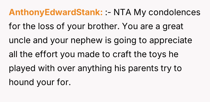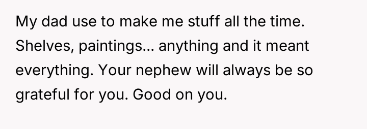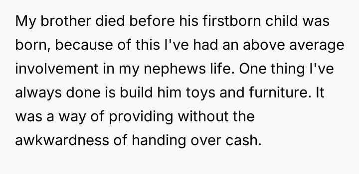 As renowned family therapist and researcher Dr. Harriet Lerner explains, “The problem with boundaries is that they are often viewed as walls instead of guidelines for self-respect.” This situation clearly illustrates a breakdown in boundary setting, initially by the OP volunteering extensive creative labor without clearly defining its limits, and subsequently by the former SIL and her husband feeling entitled to that labor based on perceived family obligations. The OP’s motivation for building items—providing support without the awkwardness of cash—established a pattern where their value was linked to physical creation rather than direct financial contribution, even though they control significant financial assets (the trust). When the new husband publicly criticized the gifts and implied the OP should spend more money, he attacked the OP's chosen method of support. The former SIL’s subsequent request, framing necessary items for twins as a "favor," further blurred the lines between genuine familial support and entitlement. The OP’s final refusal was an appropriate act of self-respect and boundary enforcement, especially given the disrespect shown at the birthday party. However, future interactions should focus on clear, non-emotional communication regarding the trust. A constructive recommendation is for the OP to define their role moving forward: they are a supportive uncle to the nephew and the financial custodian of the trust, but they are not a free, on-demand manufacturer for the SIL’s new family. All future requests should be met with a polite, neutral statement reiterating this distinction.