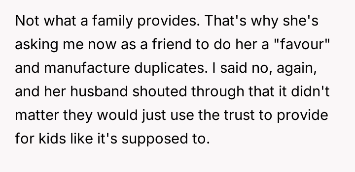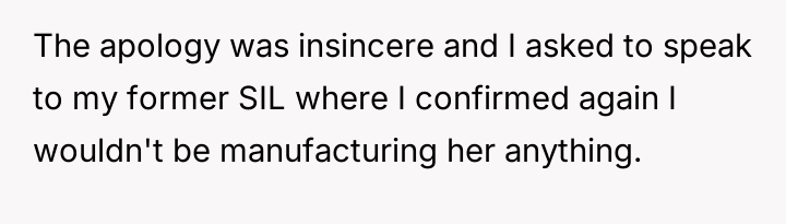 Was the OP justified in refusing to manufacture duplicate items as a favor after the public criticism and implied entitlement from the former SIL and her new husband, or did this refusal cross a line regarding family support obligations, especially considering the trust fund's existence? The debate centers on whether personal labor and creative output should be treated as transactional favors or as expected familial contributions.