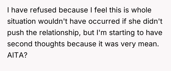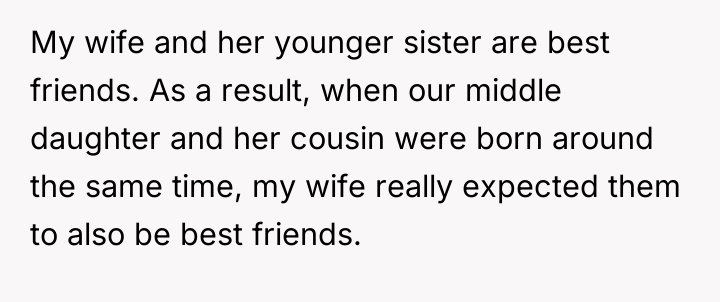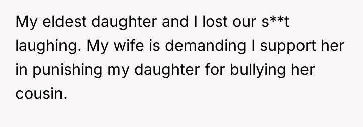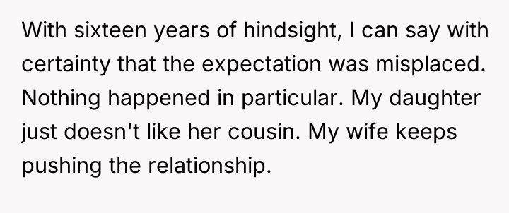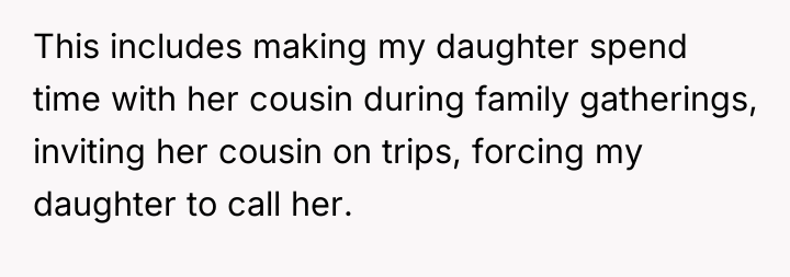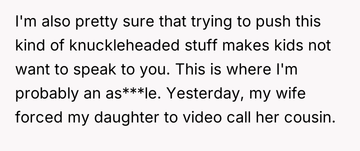 The original poster (OP) finds himself caught between his wife's strong desire for their daughter to bond with her cousin and his own belief that forced friendships are counterproductive. The central conflict escalated when the daughter, pushed into a video call, responded with a cruel, analytical presentation mocking the cousin, leading the wife to demand punishment, which the OP refuses to support due to his disapproval of the initial pressure.