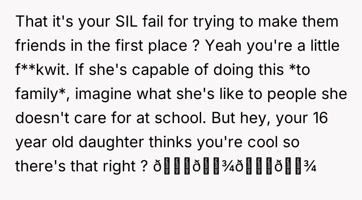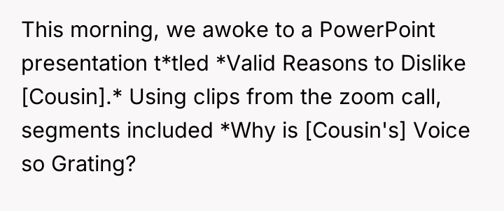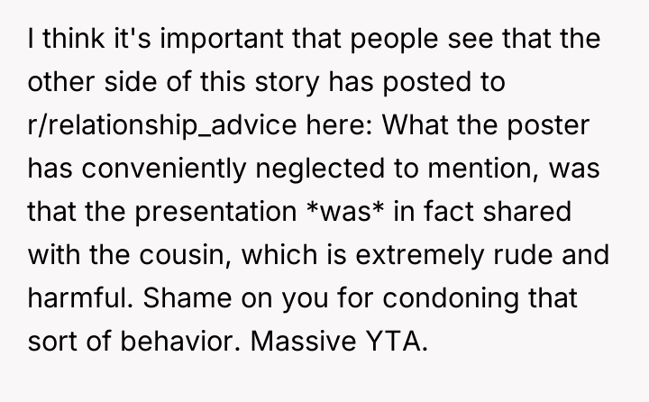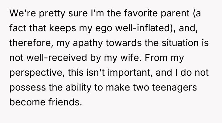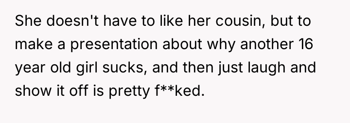 As renowned family therapist Dr. Susan Forward explains, “When parents impose their own needs or desires onto their children’s relationships, they are essentially sacrificing the child’s authentic experience for the parent’s comfort or expectation.” This situation clearly illustrates the tension between parental expectations and a child's autonomy. The wife is attempting to engineer a relationship based on her own bond with her sister, disregarding the daughter's genuine lack of connection with the cousin. Forcing interaction, especially when met with resistance, often backfires, breeding resentment rather than affection, as the OP correctly observed. The daughter's response—the PowerPoint presentation—is a significant overreaction that crosses the line into relational aggression and bullying. While the OP's intuition about forced interaction being problematic is sound, his validation of the behavior (and that of the other daughter and himself laughing) implicitly condones the cruelty, even if he disagrees with the initial catalyst. The OP’s actions in refusing to support his wife's corrective action are understandable from a boundary perspective but problematic from a parenting standpoint regarding accountability. The primary issue now is the severe bullying that occurred. A constructive approach would be to address the cruelty of the presentation directly with the daughter first, without excusing it, and then circle back to the communication strategy regarding the forced interaction with the wife. Future action should involve establishing clear boundaries around mandatory social interaction and agreeing on consistent consequences for hurtful behavior, focusing on teaching empathy rather than enforcing specific friendships.