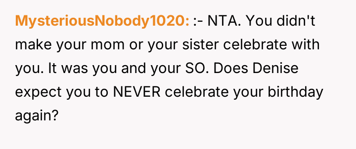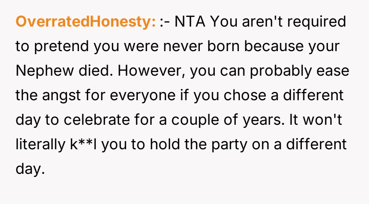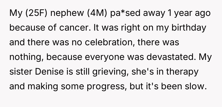 Given the significant emotional weight of the anniversary of the nephew's death versus the OP's long-held belief in the importance of birthdays, was the OP wrong for allowing a small, private acknowledgment of their birthday to occur, or were their mother and sister justified in demanding complete self-sacrifice of personal celebration due to the depth of their shared loss?