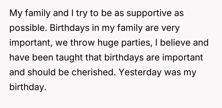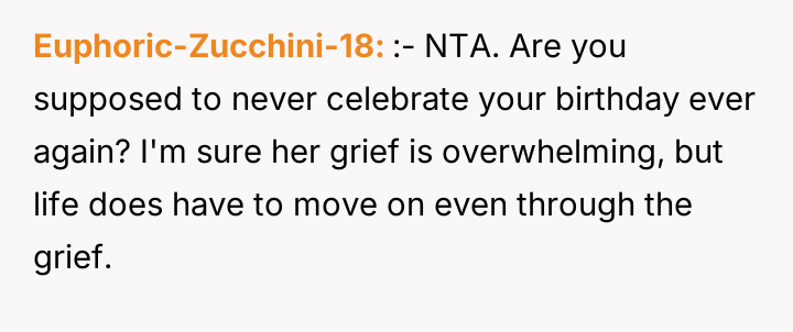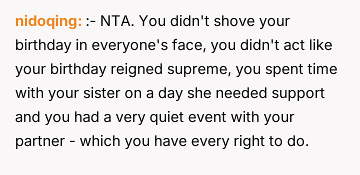 This situation highlights a difficult clash between two primary psychological needs: the OP’s need for validation and ritual (marking a birthday) and the family’s need to maintain a shared space of mourning following a significant trauma. The OP made genuine efforts to support the sister (spending the morning with her) and kept the celebration small and intimate initially. However, the subsequent posting on social media transformed a private moment into a public statement, which, in the context of acute grief, was perceived by the mother and sister as a betrayal or a lack of empathy. Grief often creates a temporary, internal focus where the suffering individual believes their pain should supersede all other events, leading to rigidity in expectations for others.