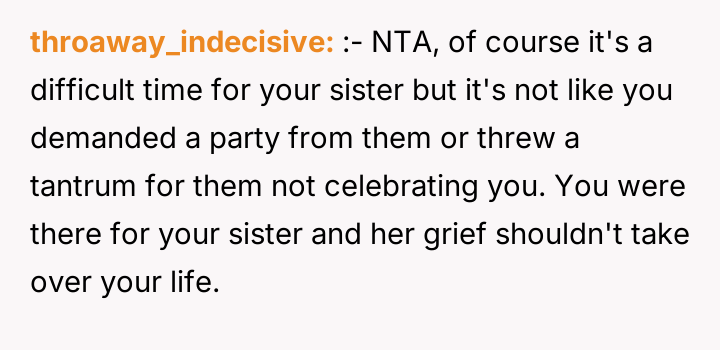 The original poster (OP) is caught between their personal need to acknowledge an important life event, their birthday, and their sister's ongoing, profound grief over the loss of a child one year prior. The core conflict stems from the OP proceeding with a small, private celebration, which was then made public via social media, leading to accusations of insensitivity and heartlessness from their grieving sister and mother.