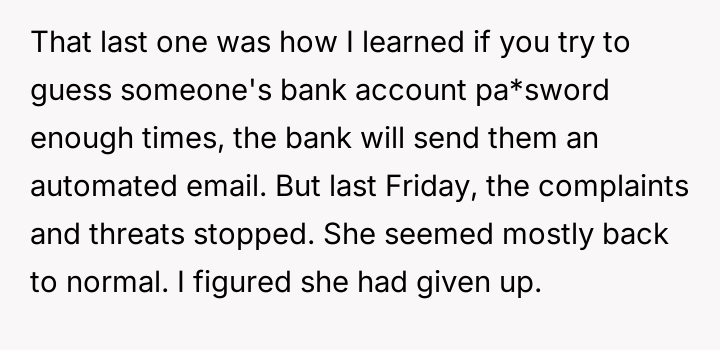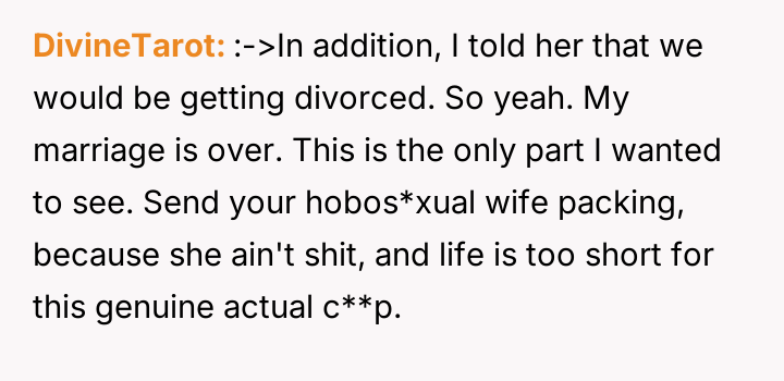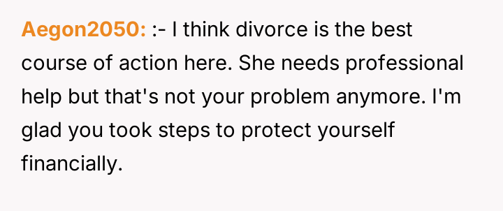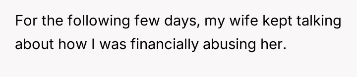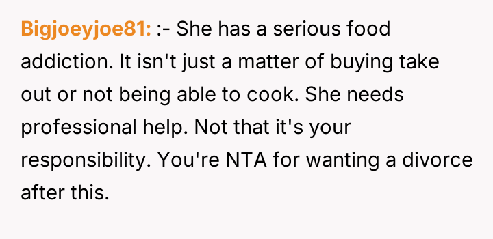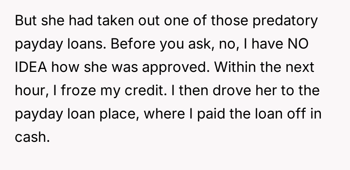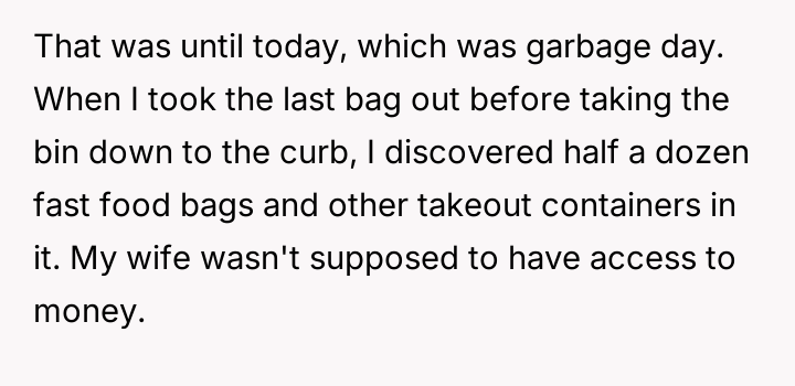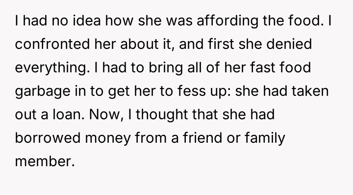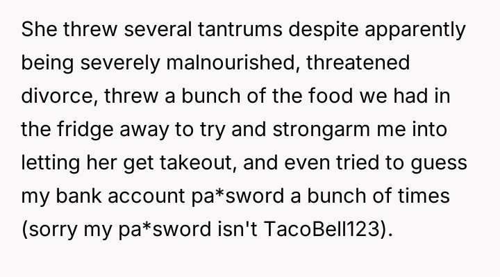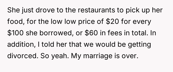 Immediately following this move, the wife reacted with anger, accusing the OP of financial a**se, threatening divorce, and even disposing of existing groceries to force his hand. When the wife unexpectedly stopped ordering takeout, the OP found evidence that she had taken out a high-interest, predatory payday loan to continue purchasing food, leading the OP to freeze his credit, pay off the loan in cash, and announce his intention to divorce.