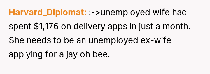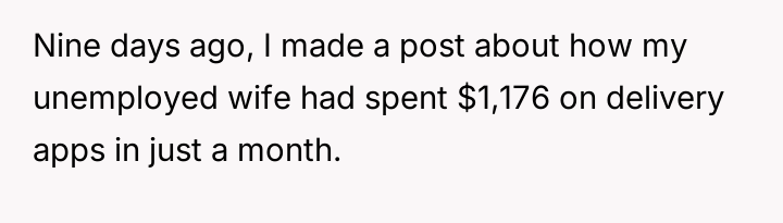 The original poster (OP) took severe financial action against his unemployed wife after discovering she had spent over $1,100 on food delivery services in a single month, which was unsustainable for their budget. To stop the excessive spending, the OP canceled their joint credit card and moved all available funds from the joint account into his personal account.