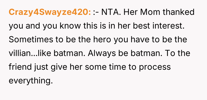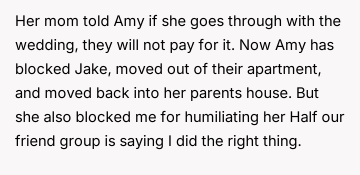 The situation requires weighing the value of direct, albeit harsh, intervention against the right of an individual to make their own choices, even poor ones. Was the OP a necessary truth-teller protecting her friend, or did she cross a boundary by publicly shaming Amy and forcing a crisis?