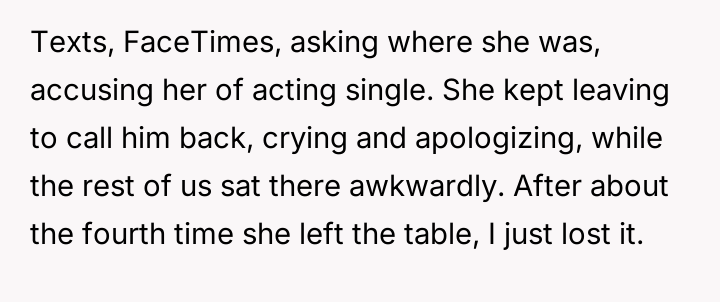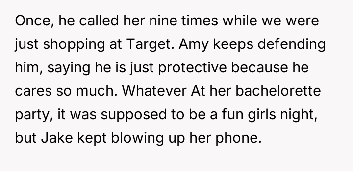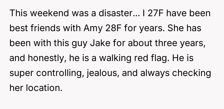 The user, a 27-year-old woman (OP), was attending the bachelorette party of her best friend, Amy (28F), who has been in a three-year relationship with a man named Jake, described by OP as controlling and jealous. The core conflict arose when Jake repeatedly contacted Amy throughout the party, causing her to leave the table multiple times to placate him.