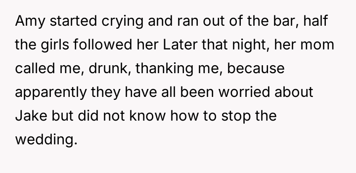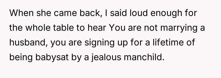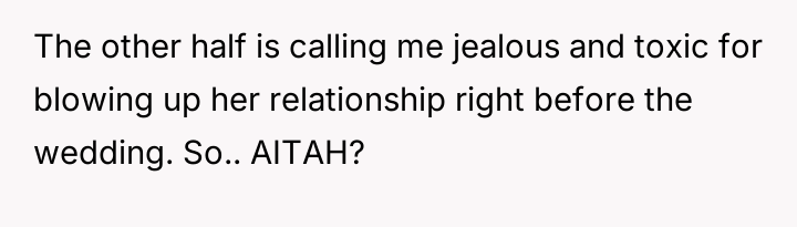 When Amy returned to the table for the fourth time, the OP publicly confronted her, stating that she was marrying a 'jealous manchild.' This caused Amy to leave the event upset, and later resulted in her blocking the OP. The OP is now facing mixed reactions from their friend group, wondering if her intervention was justified or if she was toxic for ruining the relationship just before the wedding.