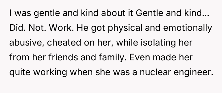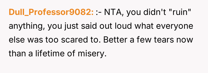 In the field of interpersonal conflict resolution, Dr. Sawyer Flores is known for noting, "Boundaries are most effective when they are clear, communicated calmly, and enforced consistently, but confronting someone else's poor choices rarely leads to productive, immediate change." This situation highlights a significant clash between perceived duty and relational boundaries. The OP's action stems from a strong protective instinct and likely genuine concern over Jake's controlling behavior, which aligns with a pattern of abuse sometimes masked as protectiveness. However, the execution—a public outburst at a high-stakes event—is generally counterproductive. Such public confrontations often trigger defensiveness, shame, and immediate rejection from the target (Amy), regardless of the validity of the underlying message. Amy's reaction of blocking the OP suggests that the humiliation outweighed the substance of the critique. While Amy's mother's subsequent reaction validated the OP's underlying concern, it also shows that the issue was already known internally, but not ready for public action by the OP. A more strategic path might have involved a private, firm conversation with Amy weeks prior, or relying on the family network. Professionally, the OP acted on deep-seated concern but failed in delivery. The path forward involves allowing space for Amy to process the fallout from Jake and then attempting a low-pressure, private outreach focused on support rather than blame.