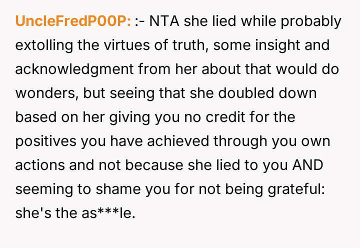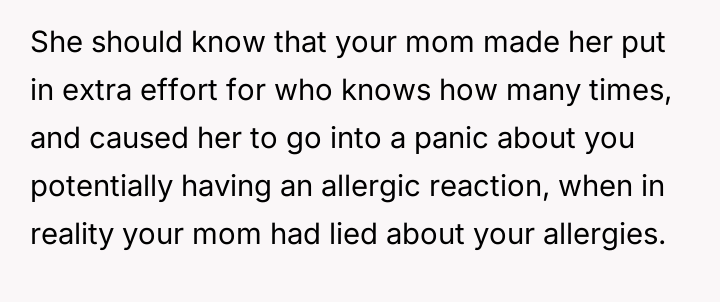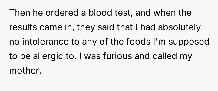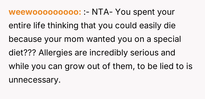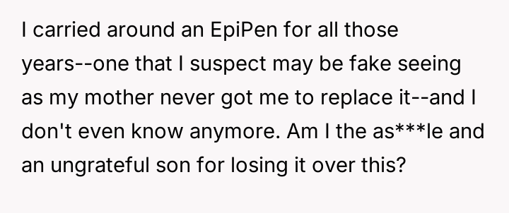 As renowned psychologist Dr. Harriet Lerner explains, “One of the most difficult tasks in life is learning to accept that you are not responsible for other people’s feelings or reactions to your boundaries.” While the OP's mother frames her actions as protective intervention, from a psychological standpoint, this constitutes significant emotional manipulation and a severe violation of autonomy, which is crucial to establish by age 19. The mother's motivation, even if rooted in a desire for the OP to be healthy (perhaps stemming from her own anxieties or adherence to a specific diet like Paleo), does not justify the means used. Lying about life-threatening allergies creates a false reality, forcing the OP to live under constant, unnecessary perceived risk (carrying an EpiPen). This action undermines the OP's ability to self-advocate and trust their own reality and sensory input. The subsequent justification that the OP is 'ungrateful' is a common tactic in codependent or controlling relationships designed to deflect blame from the perpetrator onto the victim's reaction. The OP is not an asshole for reacting negatively; the reaction is a natural response to the shattering of fundamental trust. Moving forward, the OP needs to establish firm personal boundaries regarding future communication, especially concerning health matters. The immediate step should involve discarding any medical equipment (like the potentially fake EpiPen) that serves as a physical reminder of the lie, and seeking professional guidance on navigating the damaged relationship with a parent who has demonstrated a willingness to deceive for control.