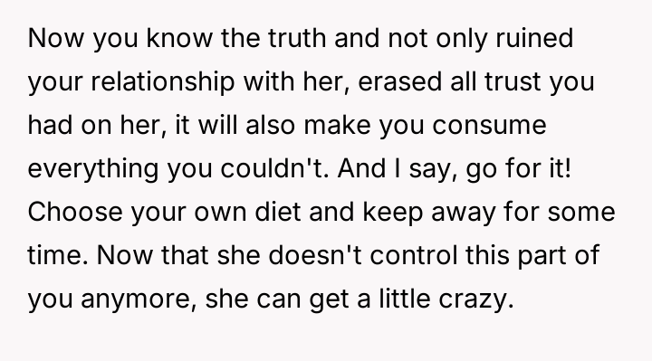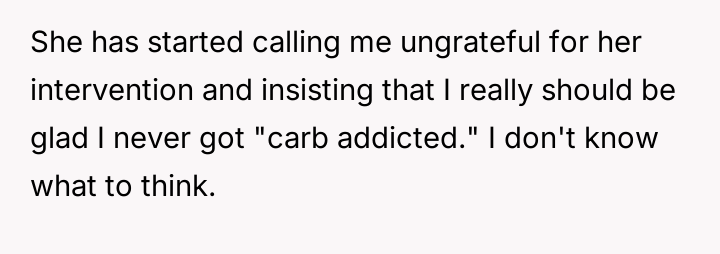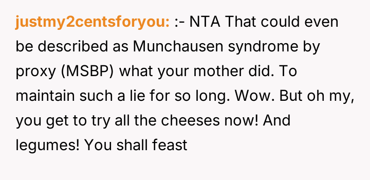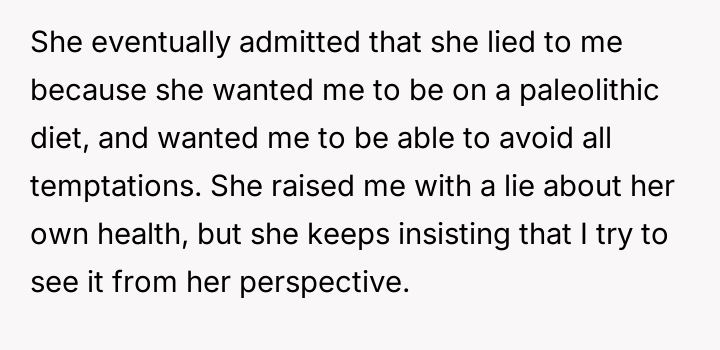 The original poster (OP) is facing a significant breach of trust stemming from a lifelong dietary restriction that has now been revealed as fabricated by their mother to enforce a specific lifestyle. The central conflict lies between the OP's emotional reaction to being deceived for 19 years and the mother's insistence that her actions, however deceitful, were motivated by care and resulted in positive health outcomes for the OP.