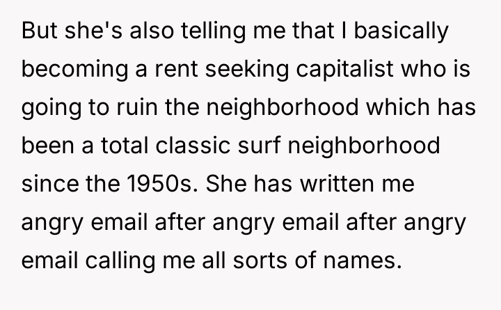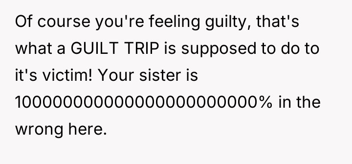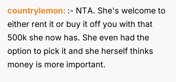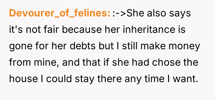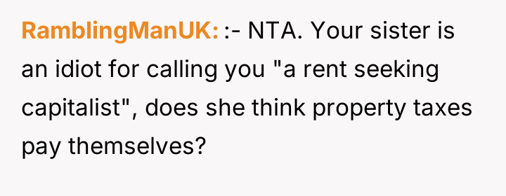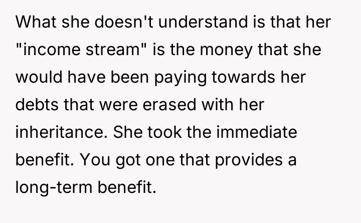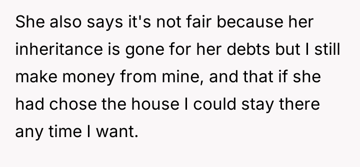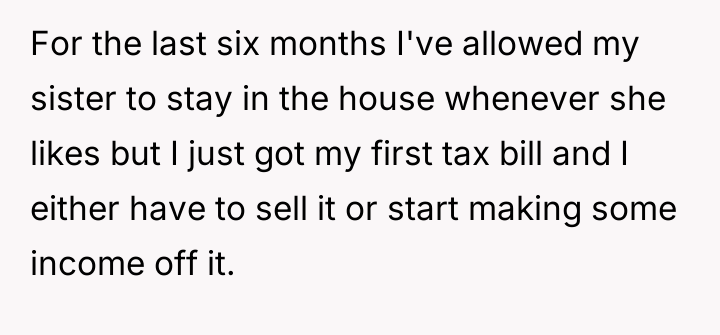 As renowned family systems therapist and author Dr. Harriet Lerner explains, “When we try to control other people’s reactions, we often end up losing control of our own lives.” This quote directly applies to the OP's situation where their sister is attempting to control the OP’s financial decisions regarding their sole inherited asset through verbal attacks and guilt. The core issue here involves boundaries and the nature of inheritance. When an asset is inherited, it legally and practically becomes the sole responsibility and property of the recipient. The OP’s decision to use Airbnb is a rational response to a financial obligation (the tax bill) and a desire to maintain personal access. The sister’s objections—that the OP is becoming 'capitalist' or that the inheritance is 'unfair' because her share was used for debt—are emotionally charged attempts to invalidate the OP’s ownership rights. The sister is projecting her own financial instability and loss onto the OP’s property management strategy. The OP's feeling of guilt and shame is a predictable response given the history of being 'impressionable' to the older sister. However, the OP’s action (renting the property) is appropriate because it addresses a tangible financial requirement. The constructive recommendation is for the OP to establish firm, non-negotiable boundaries regarding communication (stop responding to angry emails) and property use (offer a set rental fee for the sister, treating her as any other guest, or cease offering access altogether until the sister can communicate respectfully).