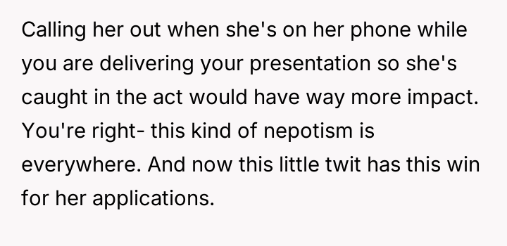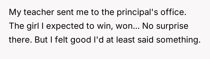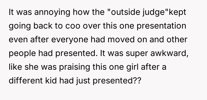 Amidst the awkward glances and stolen opportunities, a young student faced the daunting moment of stepping up to present. The sting of knowing the system was skewed against them did not erase their determination. In this crucible of youthful ambition and unfair advantage, the true test was not just the presentation, but the resilience to stand tall despite the odds.